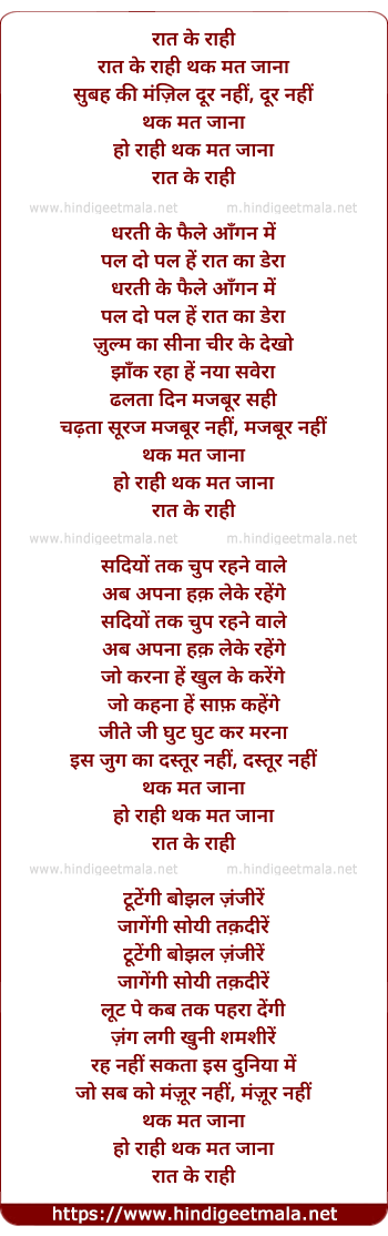 Lyrics of Rat Ke Rahi Thak Mat Jana - रात के राही थक मत जाना