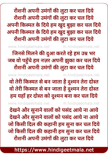 Lyrics of Raushani Apani Umangon Ki Lutaa Kar Chal Diye - रौशनी अपनी उमंगों की लुटा कर चल दिये