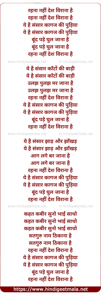 Poetic Translation - Lyrics of Rehna Nahi Des Birana - रहना नहीं देश विराना है
