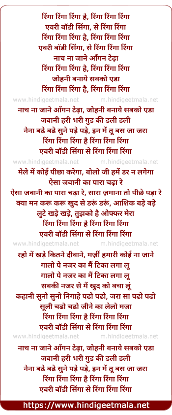 Lyrics of Ringa Ringa Hai Ringa Ringa - रिंगा रिंगा है, रिंगा रिंगा