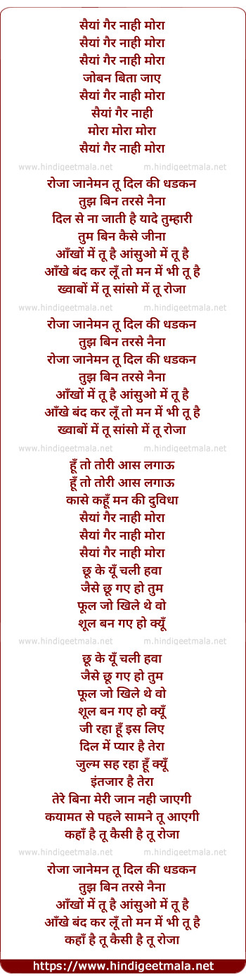 Lyrics of Roja Jaaneman - सैयां गैर नाही मोरा
