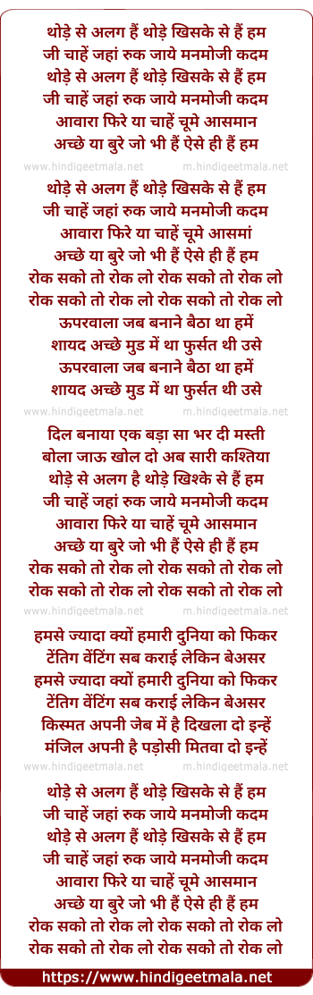 Lyrics of Rok Sako To Rok Lo, Thode Se Alag Hain - रोक सके तो रोक लो, थोड़े से अलग हैं