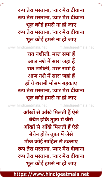 Lyrics of Roop Tera Mastana - रूप तेरा मस्ताना, प्यार मेरा दीवाना