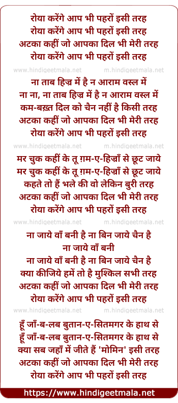 Lyrics of Royaa Karenge Aap Bhi Paharon Isi Tarah - रोया करेंगे आप भी पहरों इसी तरह