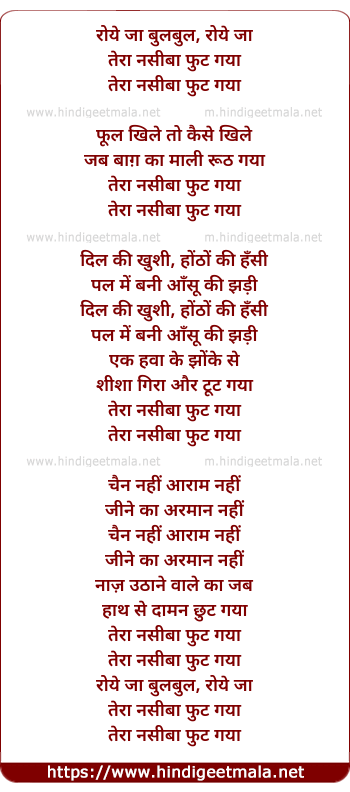 Lyrics of Roye Ja Bulbul Roye Ja - रोये जा बुलबुल, रोये जा