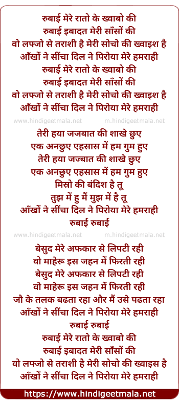 Lyrics of Rubayee, Mere Raaton Ke Khwabon Ki - रुबाई, मेरे रातो के ख्वाबो की