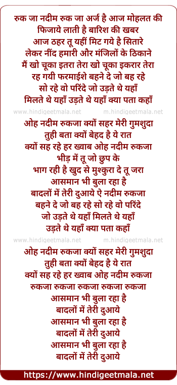 Lyrics of Ruk Ja Nadeem - रुक जा नदीम