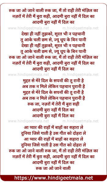 Lyrics of Ruk Jaa O Jaanevaali Ruk Jaa, Main To Raahi Teri Manzil Kaa - रुक जा ओ जाने वाली रुक जा, मैं तो राही तेरी मंज़िल का
