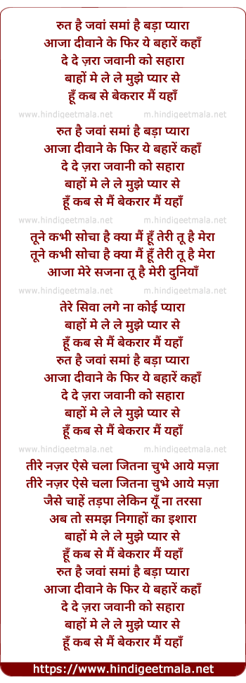 Lyrics of Rut Hai Jawa Sama Hai Bada Pyara - रुत है जवां समां है बड़ा प्यारा