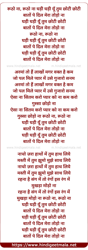 Lyrics of Rutho Na Gadi Gadi Yu Tum Choti Choti - रूठो ना घड़ी घड़ी यूँ तुम छोटी छोटी