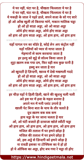 Lyrics of Saada Adda - ये घर नहीं, घंटा घर है, चीखता चिल्लाता ये घर है