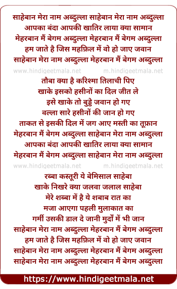 Lyrics of Saahebaan Mera Naam Abdullah - साहेबान मेरा नाम अब्दुल्ला