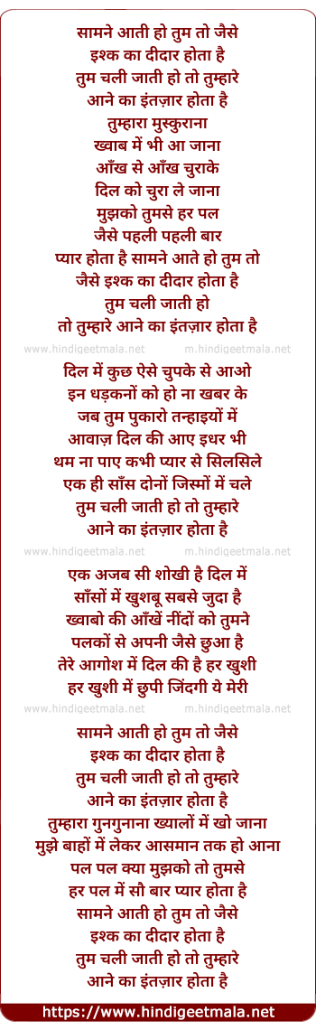 Lyrics of Samne Aati Ho Tum - सामने आती हो तुम