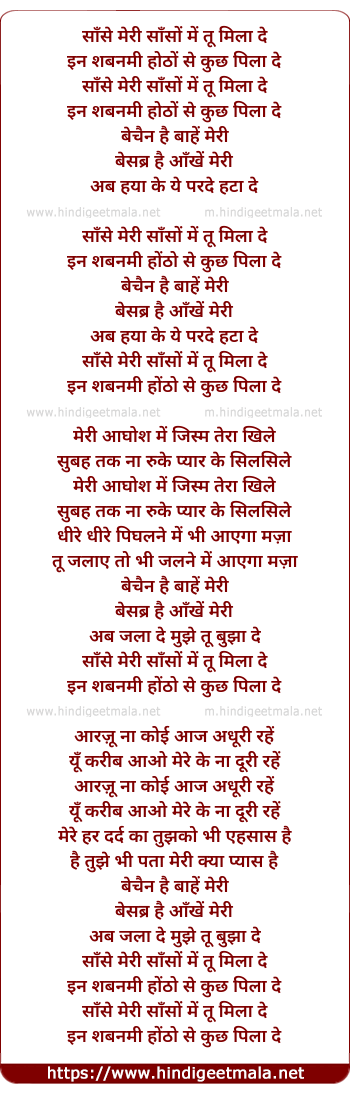 Lyrics of Saanse Meree Saanso Me Tu Mila De - साँसे मेरी साँसों में तू मिला दे