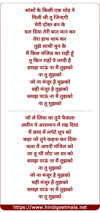Lyrics of Saanson Ke - सांसों के किसी एक मोड़ पे