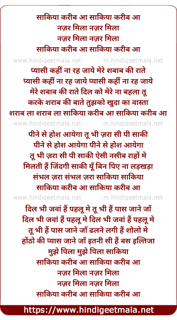 Lyrics of Saaqiya Karib Aa, Nazar Mila - साकिया करीब आ, नज़र मिला