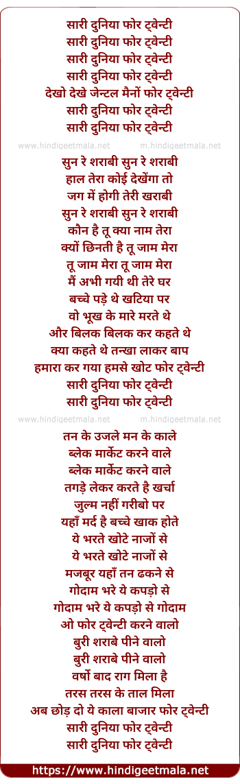 Lyrics of Saari Duniya Four Twenty - सारी दुनिया फोर ट्वेन्टी