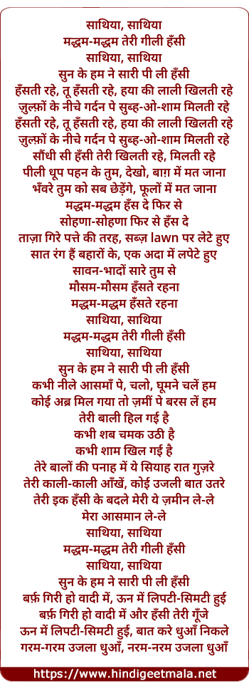 Lyrics of Saathiya O Re Saathiya - साथिया ओ रे साथिया
