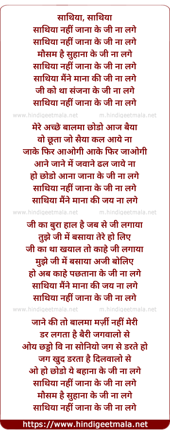 Lyrics of Saathiyaa Nahin Jaanaa Ke Ji Naa Lage - साथिया नहीं जाना के जी ना लगे