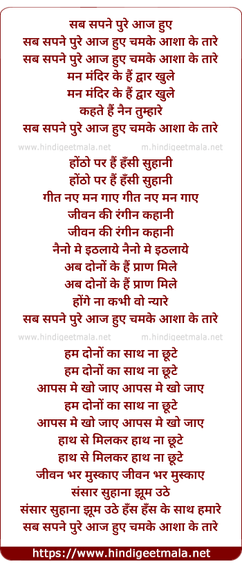 Poetic Translation - Lyrics of Sab Sapne Pure Aaj Hue - सब सपने पुरे आज हुए