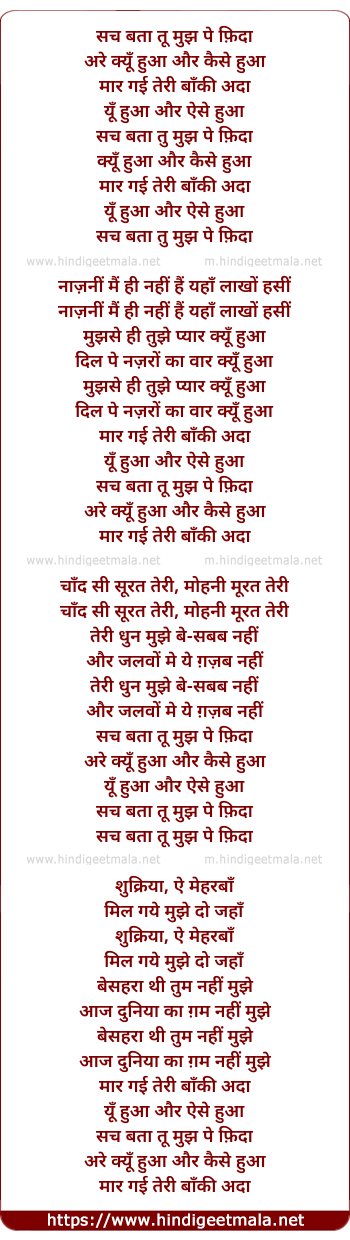 Lyrics of Sach Bataa Tu Mujh Pe Fidaa - सच बता तू मुझ पे फ़िदा