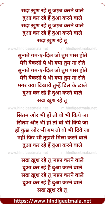 Lyrics of Sada Khush Rahe Tu Jafa Karne Waale - सदा ख़ुश रहे तू जफ़ा करने वाले