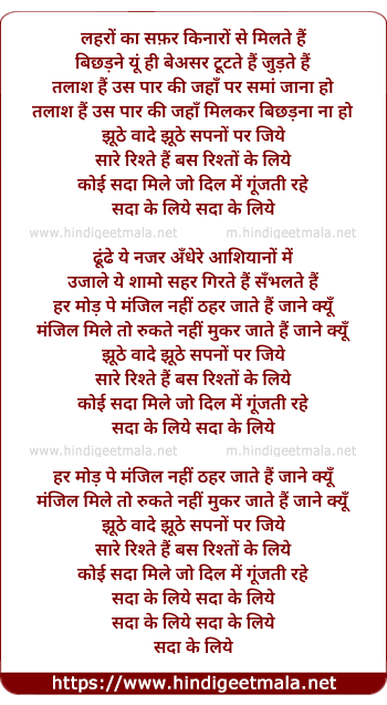 Lyrics of Sadaa Ke Liye - लहरों का सफ़र किनारों से मिलते हैं
