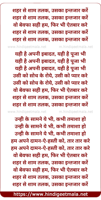 Lyrics of Saher Se Sham Talak - शहर से शाम तलक, उसका इन्तजार करें
