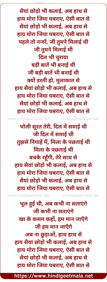 Lyrics of Saiya Chhodo Bhi Kalayi Ab Haath Se - सैयां छोड़ो भी कलाई अब हाथ से