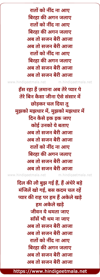 Lyrics of Sajan Bairi Aaja - रातों को नींद ना आए