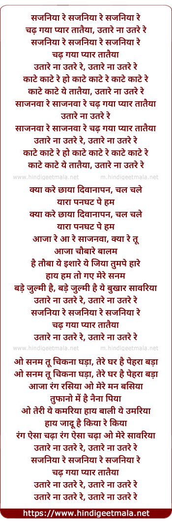 Lyrics of Sajaniyaa Re Chad Gayaa Pyaar Tataiyaa - सजनिया रे चढ़ गया प्यार तातैया