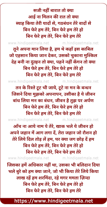 Lyrics of Saji Nahin Baarat To Kyaa, Bin Phere Ham Tere - सजी नहीं बारात तो क्या, बिन फेरे हम तेरे