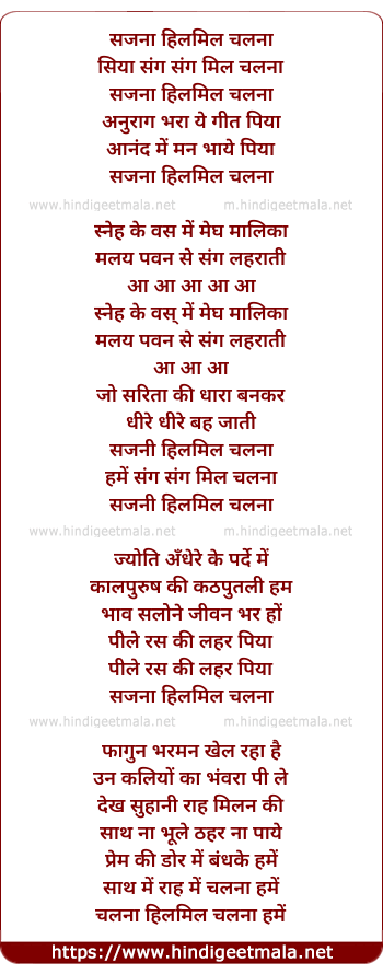 Lyrics of Sajna Hilmil Chalna - सजना हिलमिल चलना