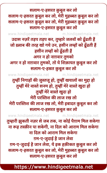 Lyrics of Salame Hasrat Kubul Karlo, Meri Mohabbat Kabul Karlo - सलाम-ए-हसरत क़ुबूल कर लो, मेरी मुहब्बत क़ुबूल करलो