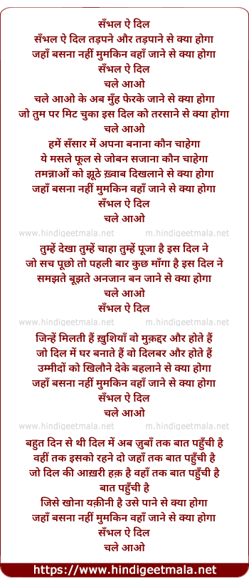 Lyrics of Sambhal Ai Dil Tadapane Aur Tadpane Se Kya Hoga - सँभल ऐ दिल तड़पने और तड़पाने से क्या होगा