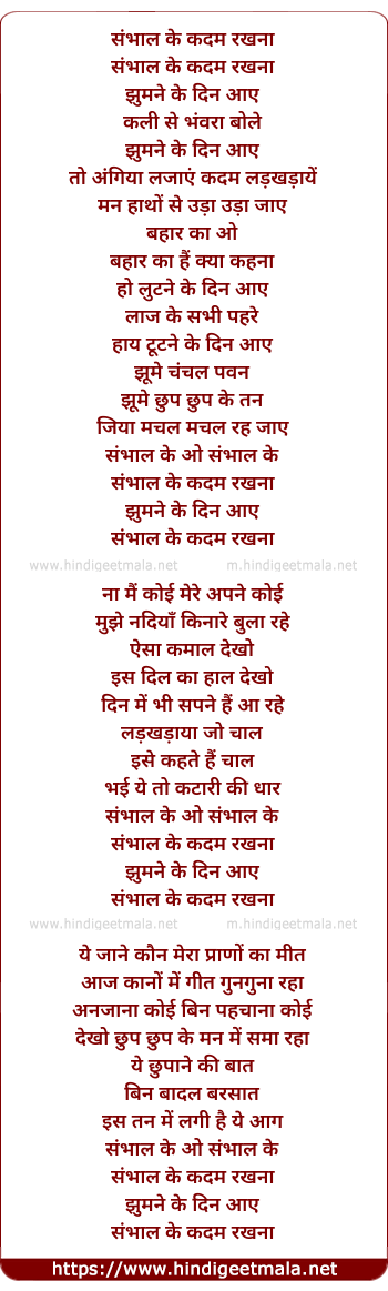 Lyrics of Sambhal Ke Kadam Rakhna - संभाल के कदम रखना