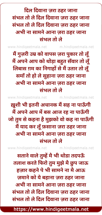 Lyrics of Sambhal To Le Dil Diwaanaa Zaraa Thahar Jaanaa - संभल तो ले दिल दिवाना ज़रा ठहर जाना