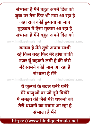 Lyrics of Sambhala Hai Maine Bahut Apne Dil Ko - संभाला है मैंने बहुत अपने दिल को