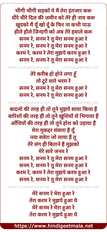 Film CastPulkit Samrat, Yami Gautam, Urvashi Rautela, Rishi KapoorSingerTulsi Kumar, Arijit Singh, Ankit Tiwari, Jaz Dhami, Neha Kakkar, Falak Shabir, Armaan MalikLyricistRashmi Virag, Mithoon, Manoj Muntashir, Manoj Yadav, Ikka, KumaarMusic ByMithoon, Jeet Ganguly, Epic Bhangra, Amaal MallikDirectorDivya Khosla KumarProducerBhushan Kumar, Krishan KumarExternal LinksSanam Re at IMDB Sanam Re at Wikipedia