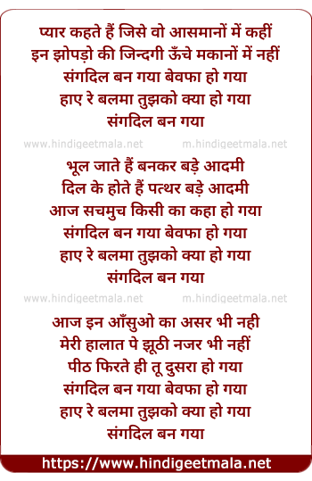 Lyrics of Sangdil Ban Gaya Bewafa Ho Gaya - संगदिल बन गया बेवफा हो गया