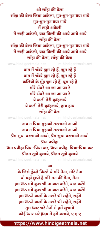 Lyrics of Sanjh Kee Bela Jiya Akela - साँझ की बेला जिया अकेला