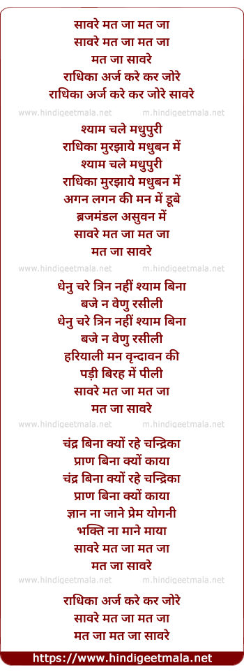 Lyrics of Sanware Mat Ja - सावरे मत जा