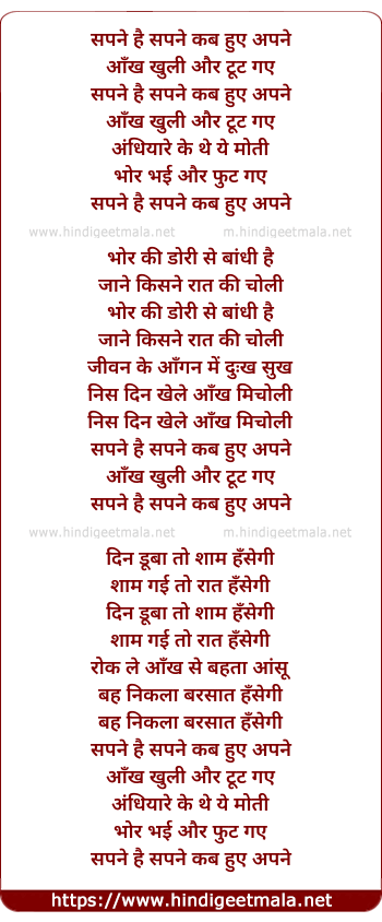 Lyrics of Sapne Hai Sapne, Kab Hue Apne - सपने है सपने कब हुए अपने