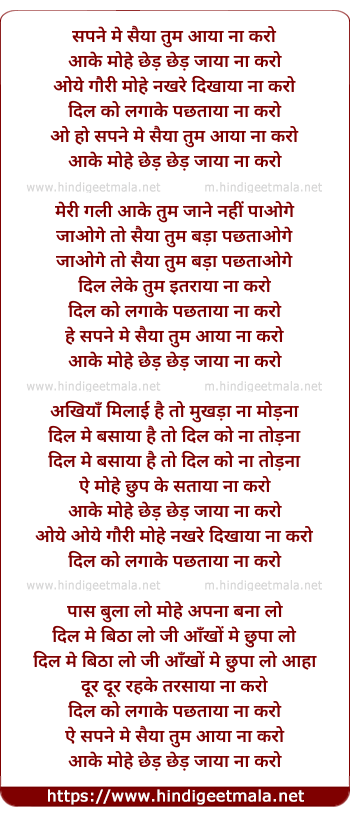 Lyrics of Sapne Me Saiya Tum Aaya Na Karo - सपने में सैया तुम आया ना करो