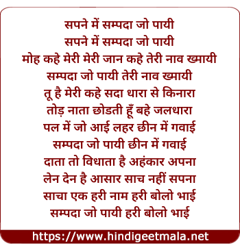 Lyrics of Sapne Me Sampada Jo Paayi - सपने में सम्पदा जो पायी