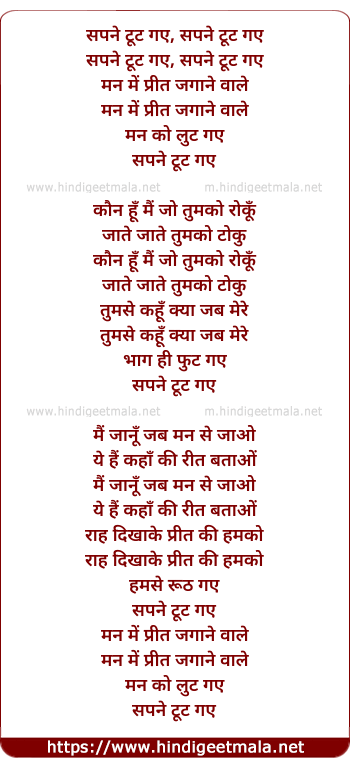 Lyrics of Sapne Tut Gaye Sapne Tut Gaye - सपने टूट गए सपने टूट गए