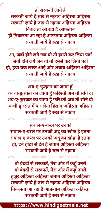 Lyrics of Sarakati Jaaye Hai Rukh Se Naqaab Aahistaa Aahistaa - सरकती ज़ाये है रुख़ से नक़ाब अहिस्ता अहिस्ता
