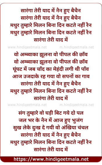 Lyrics of Saranga Teri Yaad Mein - सारंगा तेरी याद में