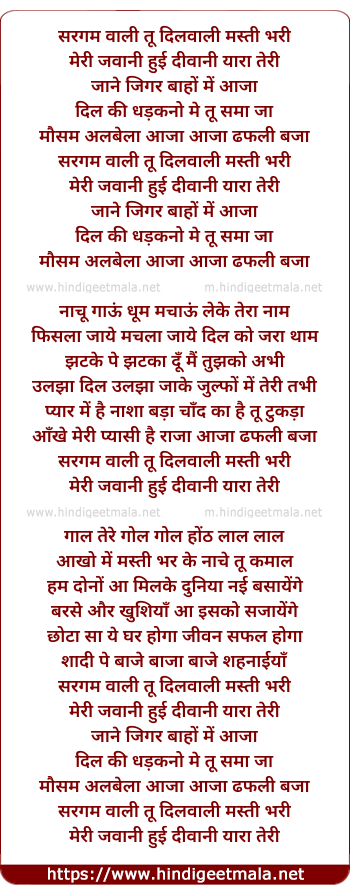 Lyrics of Sargamwali Tu Dilwali - सरगम वाली तू दिलवाली
