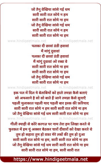 Lyrics of Jo Tenu Vekheya Sanse Gayi Tham Sari Sari Raat Soye Nahi Hum - जो तैनू वेखिया सांसे गई थम सारी सारी रात सोये न हम